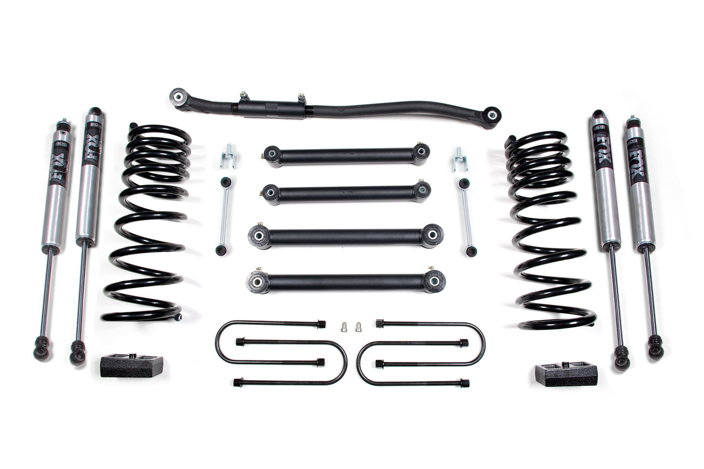 Up front the lift kit includes diesel-specific Pro-Ride coil springs, heavy duty adjustable track bar, fixed length tubular upper and lower control arms, fixed length sway bar links with stud eliminator, and precision tuned NX2 or FOX 2.0 nitrogen charged shocks. In the rear this kit utilizes heavy duty cast steel blocks, longer u-bolts, and a matching set of NX2 Nitro or FOX 2.0 Performance shocks.