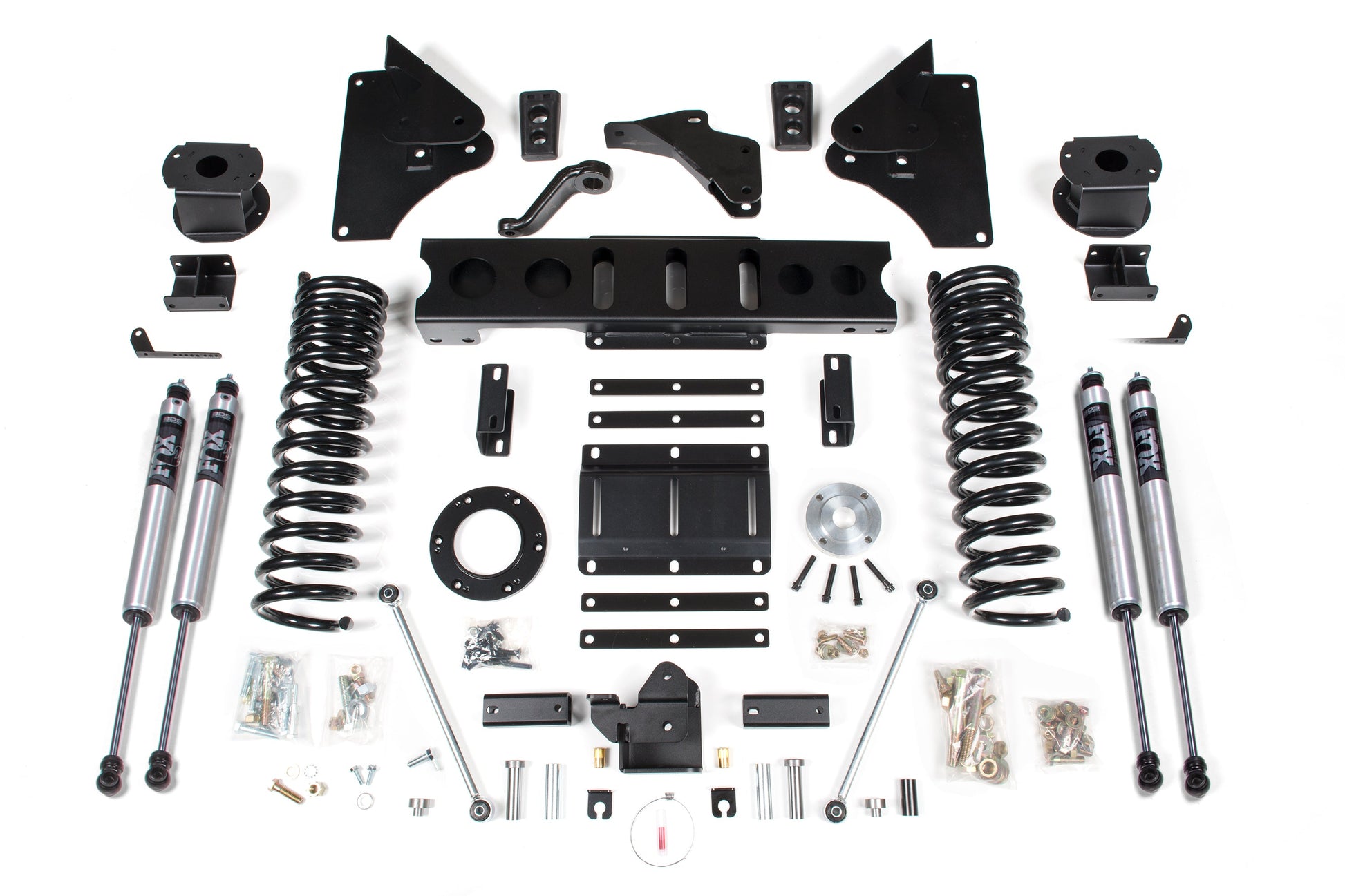 At this height, the transfer case needs to be indexed to allow use of the factory front driveshaft so an indexing ring and new transmission crossmember are supplied. In the rear this kit utilizes heavy duty air bag spacers, track bar relocation bracket to correct axle positioning, bump stop extensions, sway bar links and a matching set of NX2 Nitro or FOX 2.0 Performance shocks. BDS also supplies new air ride leveling sensor brackets to re-position the ride height sensors allowing it to perform just like it does at factory ride height and maintain full air bag range of motion.