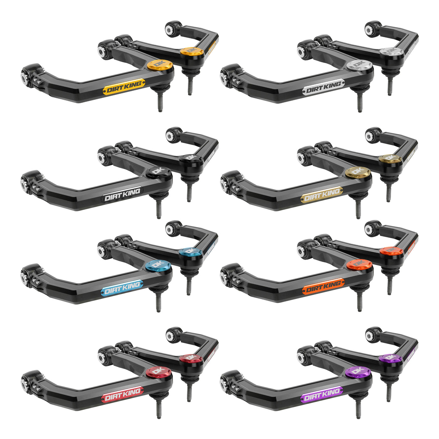 The Dirt King upper control arms must be paired with aftermarket coilover shocks to lift the vehicle. The Dirt King arms offer maximum down travel compared to the stock upper control arms. These arms are compatible with Dirt King, King, Fox, Bilstein, ADS, and Icon coilovers. Do not install these upper control arms with coil spacers paired with extended-length aftermarket shocks.